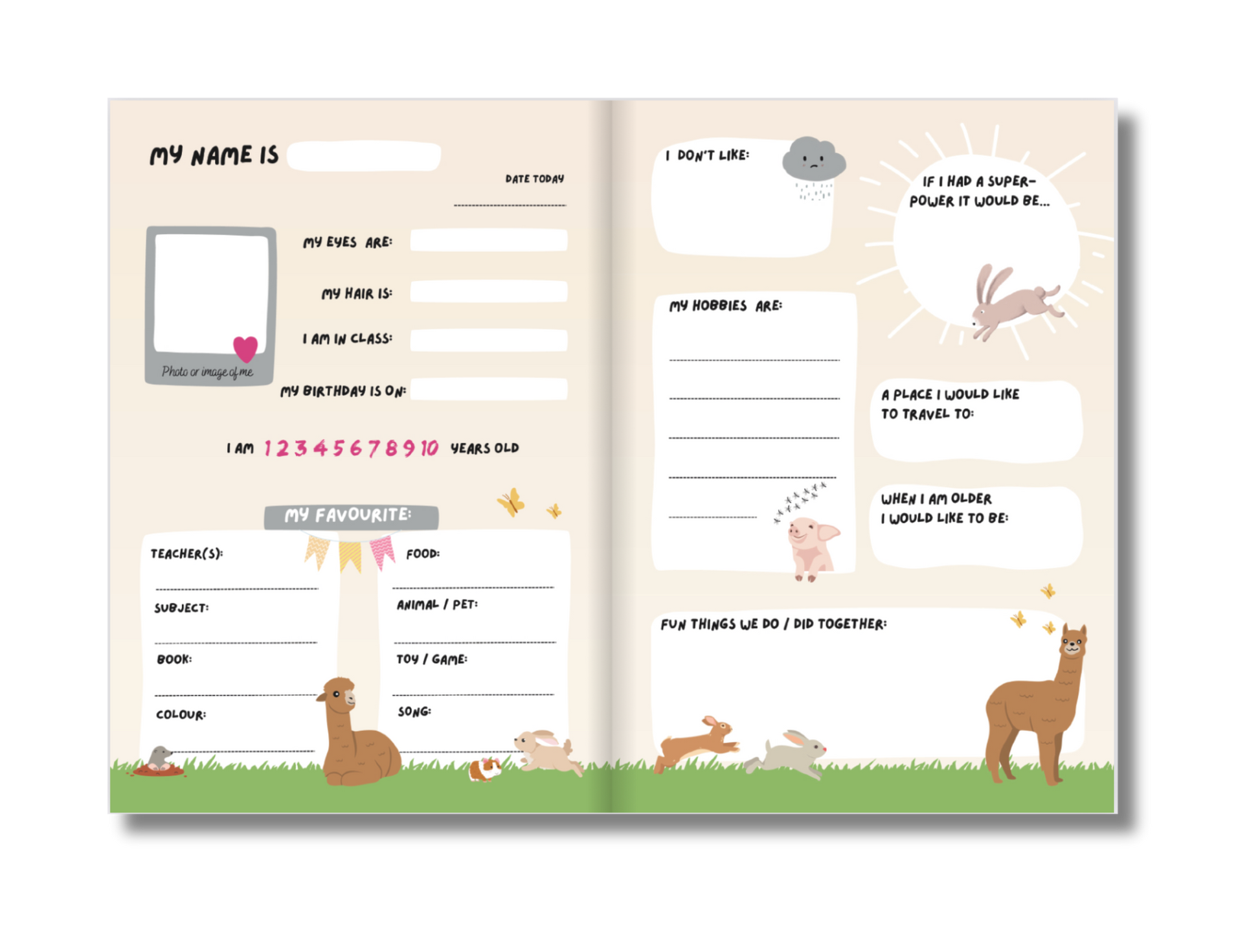 The inner pages are adorned with delightful images of horses, dogs, alpacas, pigs, and cats, perfect for both boys and girls.